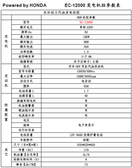 本田汽油發(fā)電機 EC12000 9KW單相+電啟動