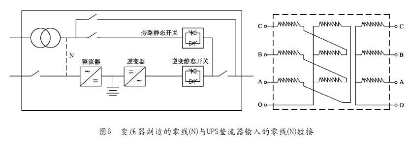 如圖6所示,將變壓器副邊的零線(N)與UPS整流器輸入的零線(N)短接,使UPS的輸入零線唯一。
