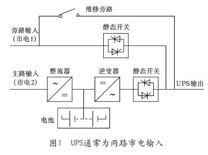 UPS通常為兩路市電輸入,其中一路市電接至整流器,另一路市電接至旁路(見圖1)。其兩路輸入市電來自于兩個不同的電網(wǎng),或來自同一個電網(wǎng)的兩個不同變壓器。這樣的兩路市電輸入,其零線可能不同,那么對于不同工作方式,內(nèi)部不同拓撲類型的UPS,將會產(chǎn)生不同的影響。