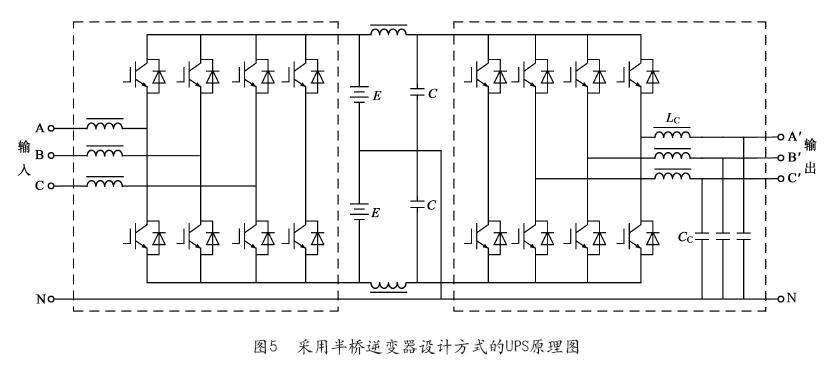 圖5所示的UPS,其內(nèi)部采用半橋逆變器設(shè)計方式,由兩組電池的中間點引出零線,該零線與整流器及旁路輸入的零線連接在一起。