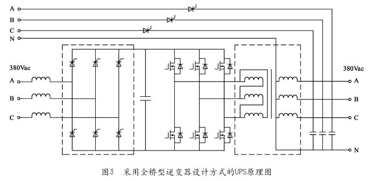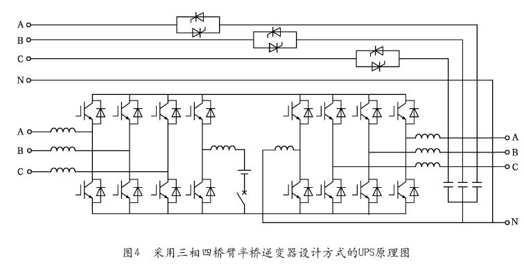 圖4所示的UPS,其內(nèi)部采用三相四橋臂半橋逆變器設(shè)計方式,由一個橋臂中點引出零線,整流器輸入也無需零線。