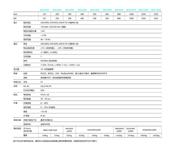 臺達Ultron DPS是結合雙重電流轉換與IGBT整流器的三相不間斷電源系統。Ultron DPS在PFC(功率因子校正)與逆變器皆采用三電平IGBT技術,AC-AC效率可高達96%。臺達先進的數字PFC控制技術亦實現了低于3%的iTHD以及大于0.99的高輸入功率因子,為客戶省下可觀的總體擁有成本(TCO)。臺達亦已強化電池管理、熱抽換風扇與簡易管理的特殊設計,以達到最高可用性。臺達Ultron DPS優異的電源效能以及高系統可用性,提供客戶更穩定的電源供應、更高的電源效率、降低資本投資,并節省整體營運成本。