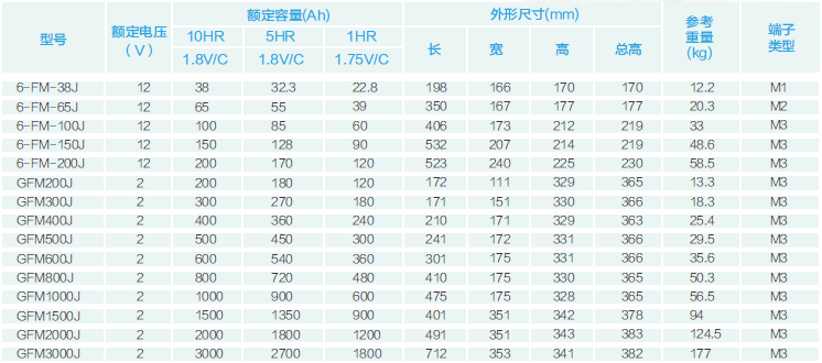 在20℃環境下,FM系列小型密封電池浮充壽命可達3~5年,FM固定型密封電池浮充壽命可達8~10年,FML系列電池浮充壽命可達10年,FMH系列電池浮充壽命可達10年,GFM系列、太陽能深循環系列電池浮充壽命可達15年,GFMJ系列電池浮充壽命可達18年。