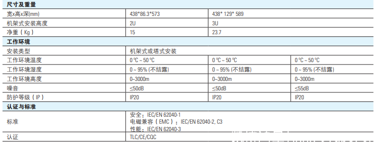 • 高功率密度,10K以內高度2U,20K高度3U,深度小于600mm;