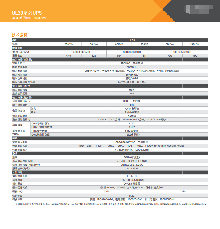 艾默生Liebert UL33系列UPS系統是連接在輸入電源和負載之間,為重要負載提供不受電網干擾、穩壓、穩頻的電力供應的電源設備,在市電掉電后,UPS可繼續給負載提供一段時間的供電。UL33系列UPS采用雙變換結構和先進的全數字控制技術,帶輸出隔離變壓器,能提供穩定、潔凈、不間斷的電源,并具備完備的網絡管理功能。